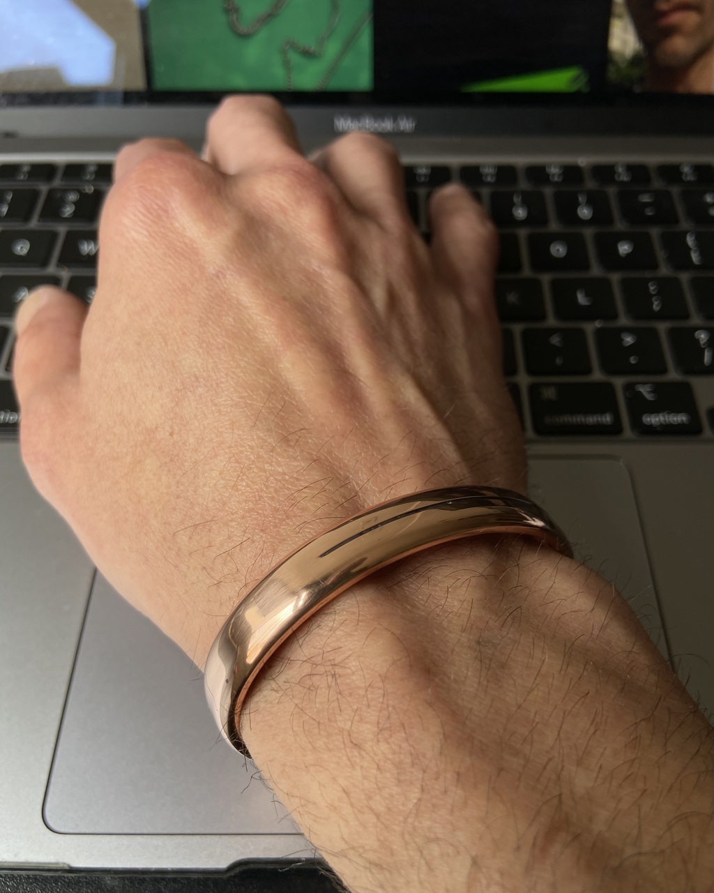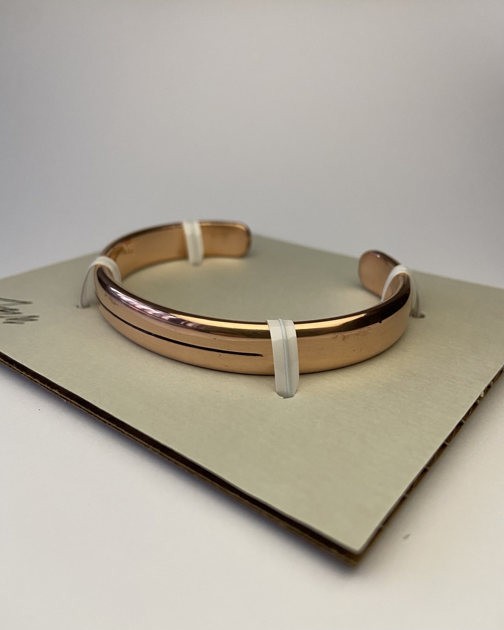 Cobre maciço esculpido, moldado e polido. Feita sob medida. Meça seu pulso com um barbante, SEM FOLGA, e veja na régua, lembrando que o cobre é um material maleável e vc mesmo consegue ajustar pra deixá-la perfeita.