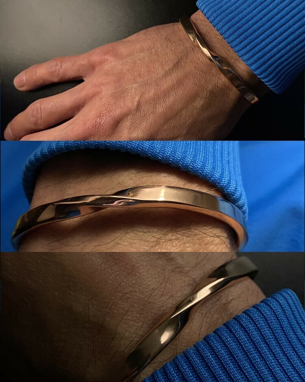 Pulseira tipo "cuff" (formato "C")" com uma torção. Cobre maciço esculpido, moldado e polido. Feita sob medida. Meça seu pulso com um barbante, SEM FOLGA, e veja na régua, lembrando que o cobre é um material maleável e vc mesmo consegue ajustar pra deixá-la perfeita.